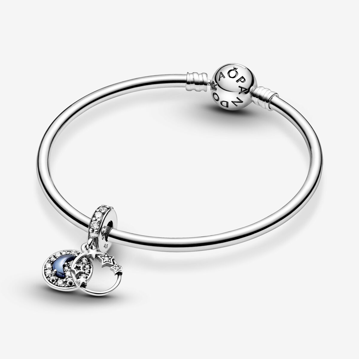 Prove your love knows no bounds with the Blue Night Sky Crescent Moon & Stars Dangle Charm. Hand-finished in sterling silver, the front dangle features an open circle decorated with stars that overlap the frame. The back disc includes a raised blue half-moon-shaped stone, which is a brand-new addition to Pandora jewellery, surrounded by clear stones with the engraving “I love you more than all the stars in the sky” on the reverse. Gift this moon and stars charm to someone special to show how much you care.