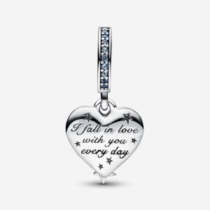 Two shooting stars come together to create a heart-shaped outline in this playful and romantic double dangle charm, crafted in sterling silver. Each star is set with a blue man-made crystal and the star trails feature clear cubic zirconia pavé. Behind the stars, a swirling galaxy effect shows through from the back part of the dangle, created with shimmering enamel in different shades of blue. The back of the enamelled part is engraved with the message “I fall in love with you every day.” Capture the magic of the night sky and gift it to the one you love.