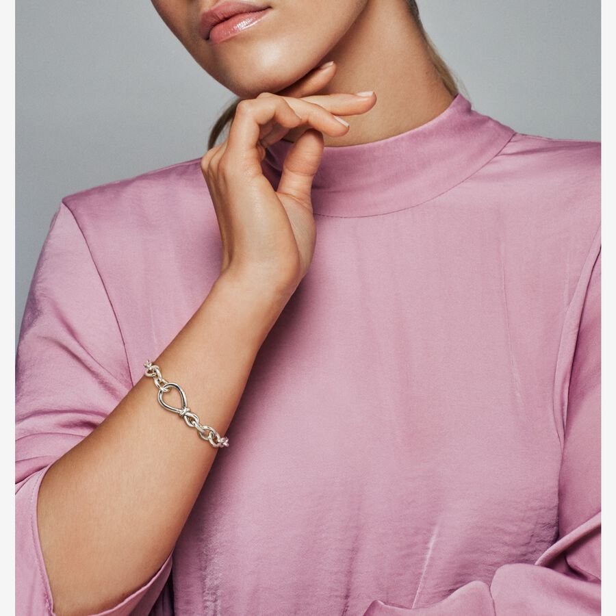 It’s double the love with Pandora’s unique interpretation of the infinity symbol. The iconic knot wraps around the asymmetrically-set center to signify the strength of the connection. This chunky sterling silver infinity knot bracelet is the perfect representation of an unbreakable bond and a classic addition to your bracelet collection. The infinity clasp opens and can be styled with up to two Pandora Moments dangle charms or pendants.
