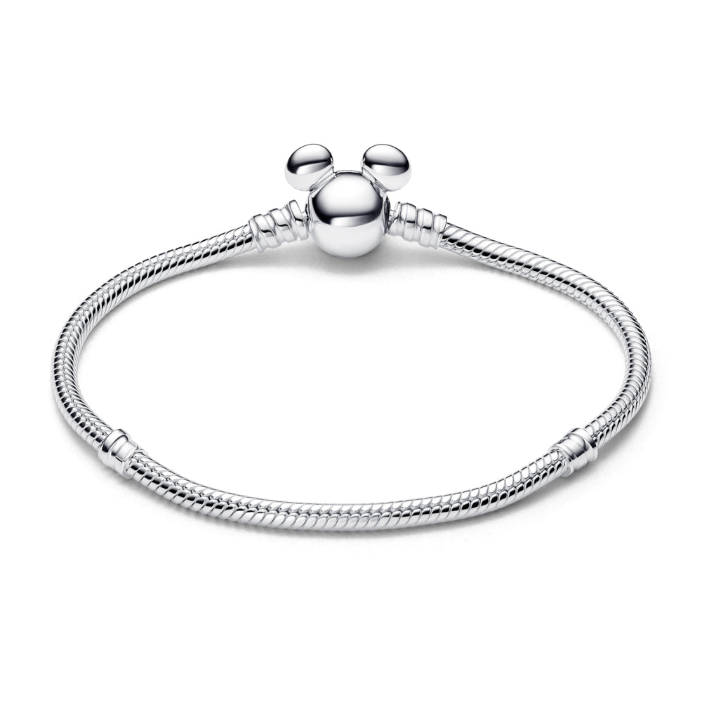 Style your Disney x Pandora charm collection on the Disney Mickey Mouse Clasp Moments Snake Chain Bracelet. This sterling silver snake chain bracelet features a clasp inspired by the iconic Mickey Mouse head silhouette. Press Mickey’s ears in opposite directions to easily open and close the clasp. The bracelet has two threaders (raised charm dividers) and can hold 16-18 charms or dangle charms. The perfect way to showcase your Disney favourites.
