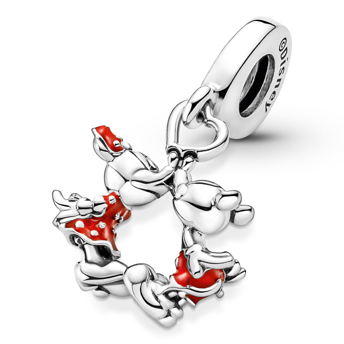 This Disney Mickey & Minnie Mouse Kissing Dangle Charm celebrates romance with one of the most iconic couples in the world. The cute kissing couple are hand-finished in sterling silver and decorated with red enamel and sterling silver beading. This adorable Disney x Pandora charm represents a happily ever after and would make a special gift for the one you love.