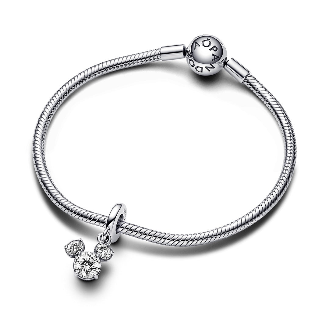 Add a sprinkling of Disney magic with the Disney Mickey Mouse Sparkling Head Silhouette Dangle Charm. Featuring three clear cubic zirconia stones arranged in the silhouette of the iconic character, this sparkling charm is the perfect holiday gift for yourself or someone special. Crafted from sterling silver, it makes a glittering addition to your favorite sterling silver charms. Just like the one that inspired it, a Mickey Mouse charm is a forever classic. Style it with your other beloved charms to bring a touch of magic to any outfit.