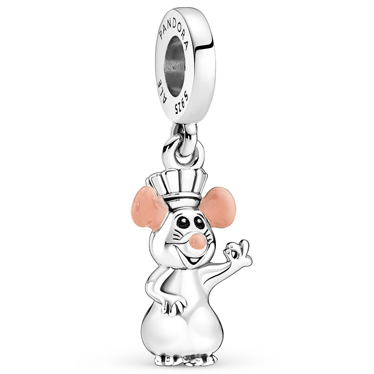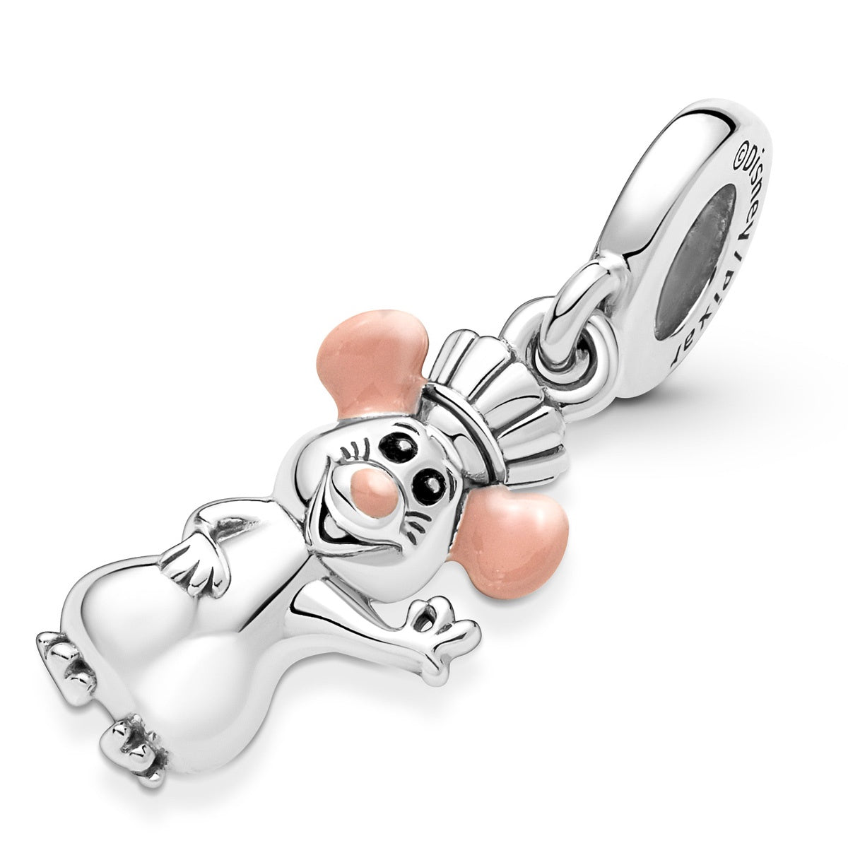 Follow your dreams with Pixar’s Remy. This sterling silver dangle charm features Remy from Disney and Pixar’s Ratatouille wearing his chef’s hat and making a chef’s kiss gesture. Hand-applied pink enamel colors his ears and nose and black enamel brings his eyes to life. Style this charm on your Pandora jewelry as a reminder to follow your heart and never give up.