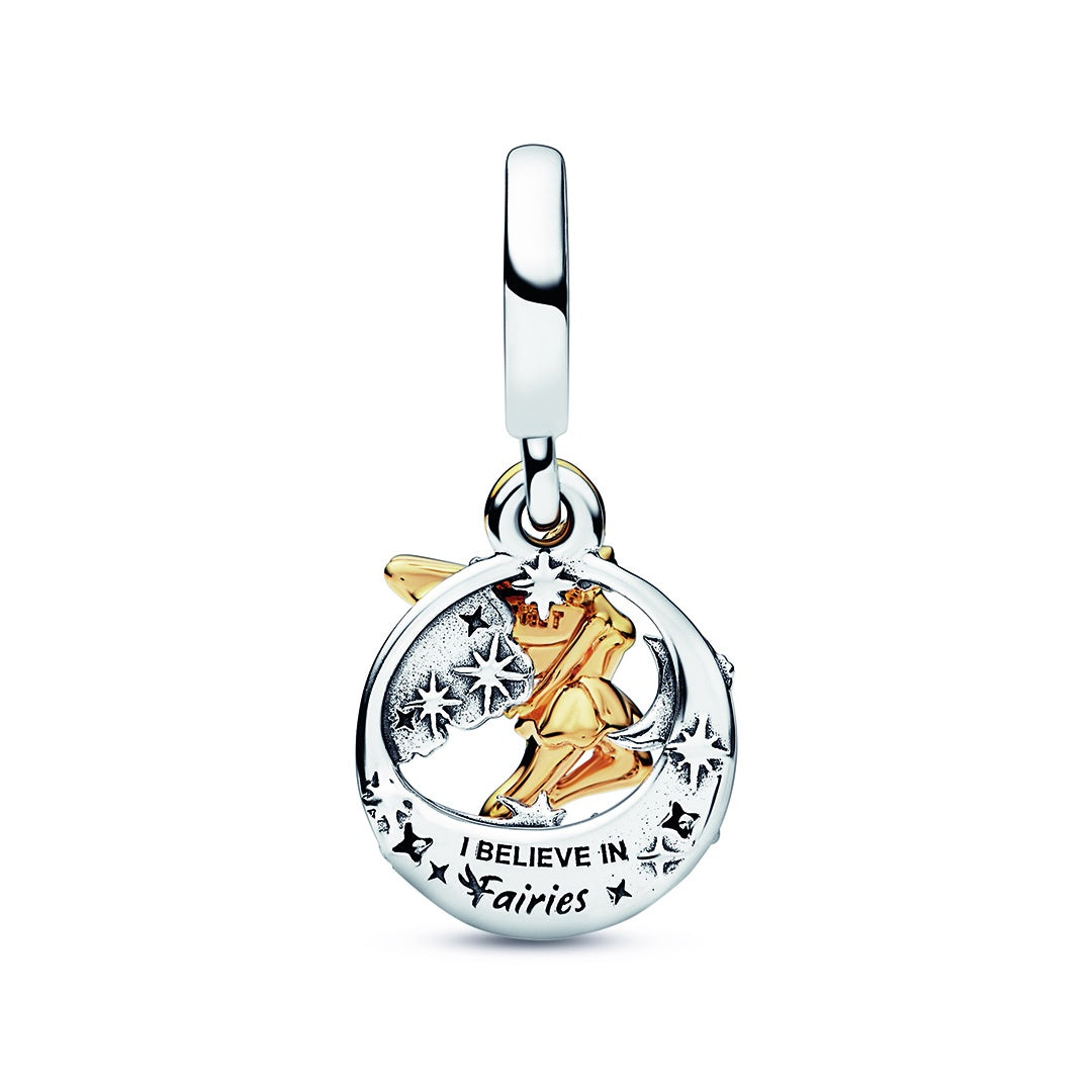 The next best thing to pixie dust, add our Disney Tinker Bell Celestial Night Dangle Charm to your collection for a touch of everyday magic. This two-tone charm is hand-finished in sterling silver and 14k gold plating and features Tinker Bell in her classic flying pose. Two brilliant-cut clear cubic zirconia mimic the light in the evening sky as she soars off to new adventures.