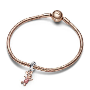 Do a happy dance with Disney’s Piglet, Winnie the Pooh’s best friend. The Winnie the Pooh Piglet Dangle Charm sterling silver dangle charm depicts little Piglet in a joyful pose, brought to life with 14k rose gold plating and transparent pink enamel over grooved lines to recreate his striped suit. The sterling silver bail features a small raised flower on either side. Style Piglet on your Pandora Moments bracelet or charm holder as a reminder of the best of friends and the best of times.