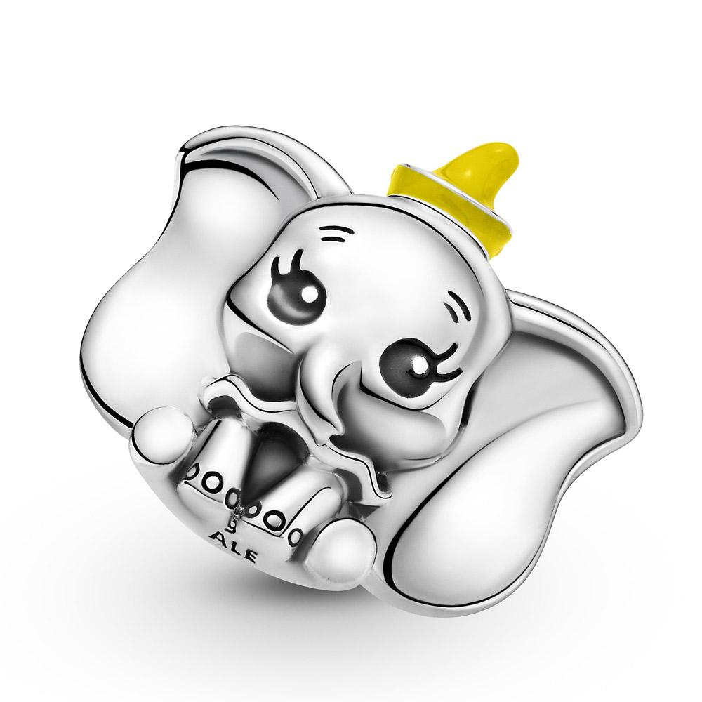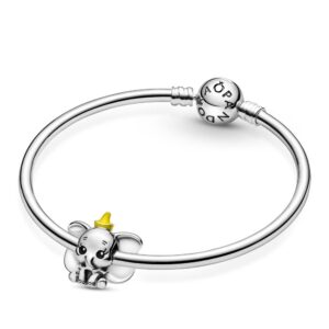 Fly high with the Disney Dumbo Charm. Hand-finished in sterling silver, this charm was designed in collaboration with Disney’s toy designers. Disney’s Dumbo features an enlarged head and smaller body for an adorable finish. The character has big polished ears, engraved toes and black hand-applied enamel eyes. Dumbo’s wearing a ruffled collar and his iconic hat covered in hand-applied yellow enamel with sterling silver detailing. Wear this magical design alongside other Disney x Pandora styles for a fun-filled look.