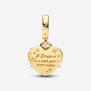 Have a ball every day with the Disney Cinderella’s Carriage & Heart Double Dangle Charm. Inspired Cinderella’s beloved story, this 14k gold-plated charm features two heart-shaped discs. One features Cinderella’s enchanted carriage in intricate openwork, with a blue marquise-shaped stone at the centre. Behind it sits the second heart-shaped disc with glittery blue enamel, and on the back is the engraved message “A Dream is a wish your heart makes.” Wear it on your favourite necklace, bracelet or charm holder as a reminder of the power of following your dreams.