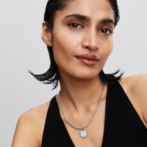 Minimalist style that makes a statement. Add our 14k gold-plated or sterling silver engravable disc pendant, encircled in a halo of sparkling stones, to your collection.