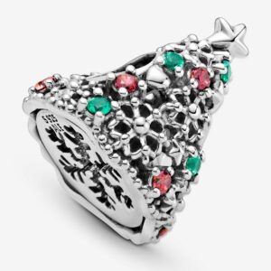 Get set for the holidays with the Glitter Christmas Tree Charm. Hand-finished in sterling silver, celebrate the magic of the festive season with this sparkling charm. This openwork Christmas tree includes stars, hearts and snowflakes alongside red and green stones to represent baubles. A star on top and cut-out snowflake on the bottom complete this highly detailed piece. Style this charm with other glittering designs to express how much you love the most wonderful time of the year.