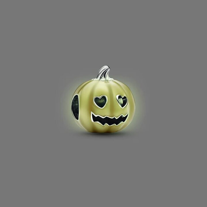 This delightful Glow-in-the-dark Spooky Pumpkin Charm in sterling silver is the perfect Halloween friend. Intricately detailed with a spooky face and heart-shaped eyes, this enamel-painted charm turns dark green when the lights go out – as if by magic. Get into the spirit of the scariest time of year by combining it with other holiday charms for a stylish Halloween look.