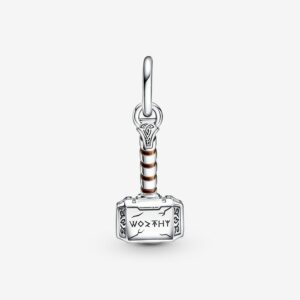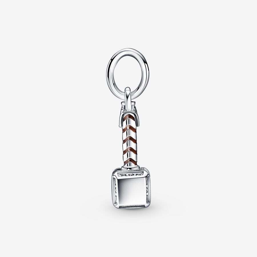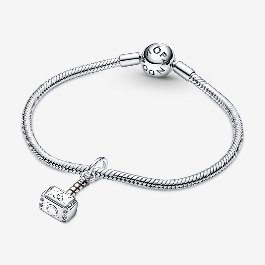 Bring the thunder with our Marvel The Avengers Thor’s Hammer Dangle Charm and share your love for the Marvel Cinematic Universe with the world. Hand-finished in sterling silver, Thor’s hammer is brought to life with swirling brown enamel, engraved scratch marks and Asgardian-style rune symbols. The side of the hammer is engraved with “Worthy” as a reminder of the source of Thor’s power. Add this charm and more of your favorite heroes to our Pandora Moments Marvel The Avengers Logo Clasp Snake Chain Bracelet.