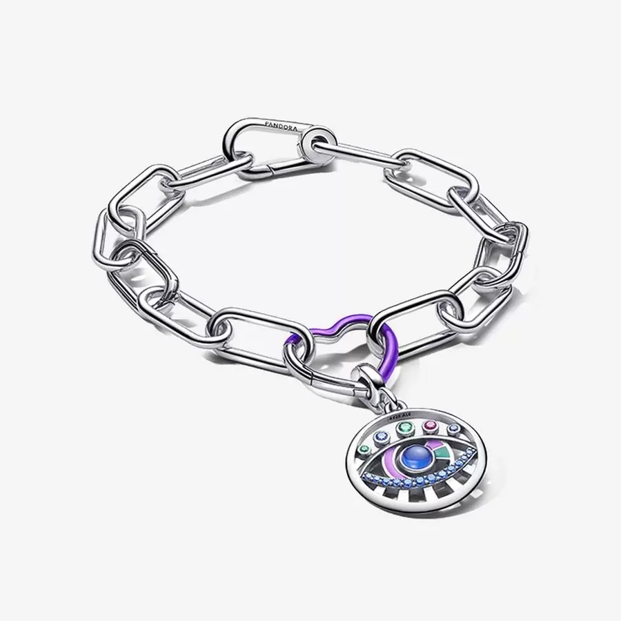 A watchful eye of security. A reminder to look beneath the surface to find inner beauty. A symbol of divine protection. Whatever The Eye means to you, this bracelet beautifully displays your affinity for this well-known symbol. Attached to a sterling silver Pandora ME Link Chain Bracelet is an eye-catching Pandora ME Bright Purple Styling Heart Connector featuring transparent bright purple enamel over a sterling silver base creating a metallic finish. It holds the Pandora ME The Eye Medallion with hand-applied magenta and green enamel and set with red, blue and green brilliant-cut crystals.