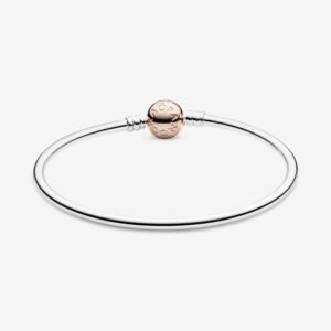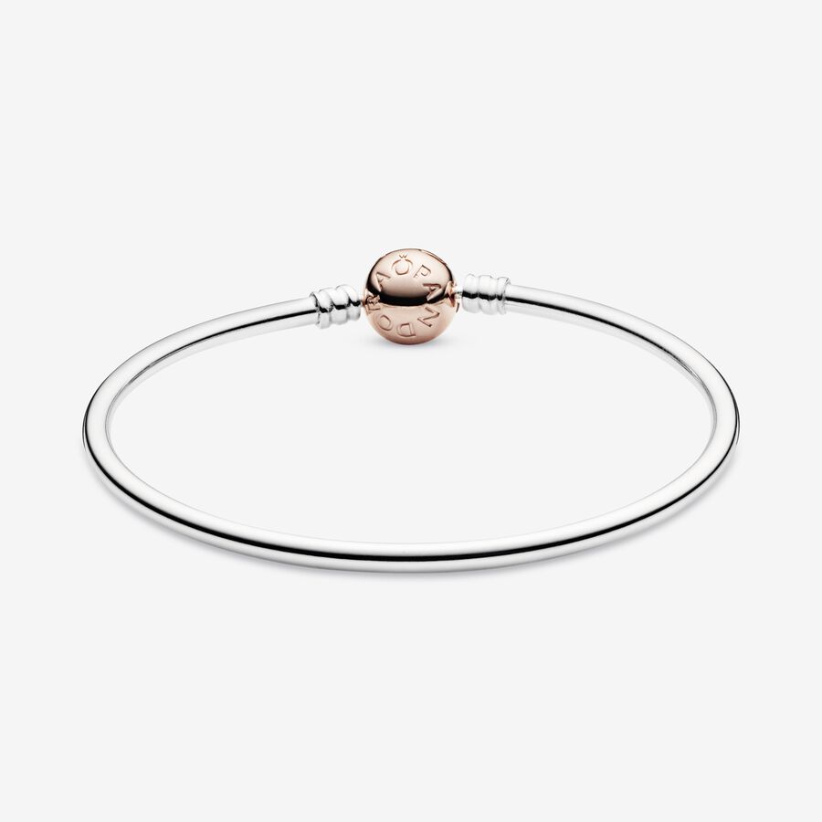 The perfect starting point for your new charm collection or a sleek addition to an existing bracelet stack, this two-tone bangle is cast from sterling silver. It features a 14k rose gold-plated ball clasp, minimally detailed with our logo, creating a harmonious pairing of silver and rose hues. The 14k rose gold plating brings a subtle pink glow to the classic piece. Wear the versatile bracelet with or without charms.
