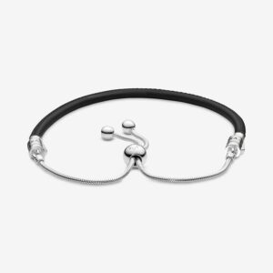 Give your look a little edge with this slider bracelet. A cool foundation for your personal edit of charms, the black leather style is finished with a sterling silver slider clasp for the perfect fit. Trimmed with end caps set with cubic zirconia, the sleek bracelet looks equally chic worn alone or layered in a stack of contrasting styles.