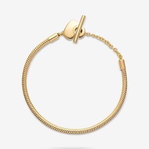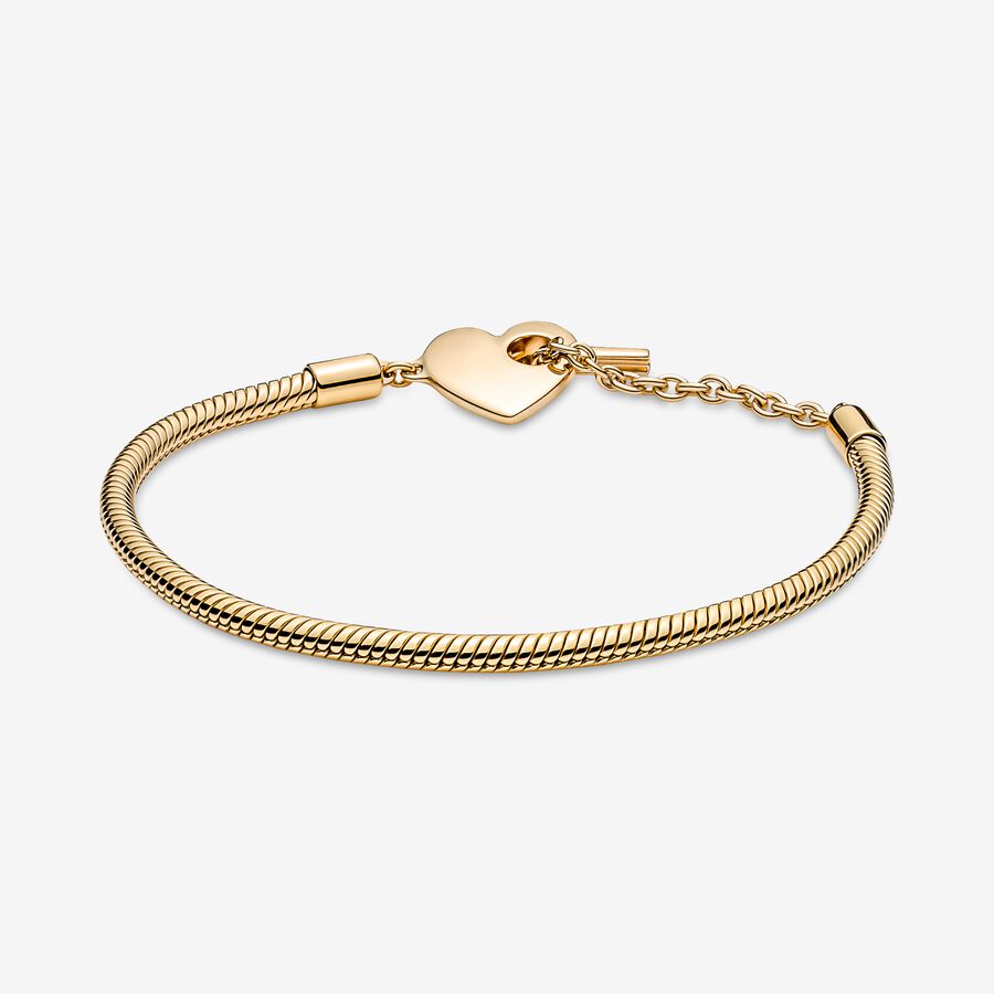 Add a luxurious touch to your loved one’s collection with the Pandora Moments Heart T-Bar Snake Chain Bracelet. Hand-finished in 14k gold plating, this piece is inspired by our classic Pandora Moments T-bar snake chain bracelet. The style features a heart-shaped disc with an open circle on one side to loop the T-bar through to open and close, while the reverse side is polished. Designed to be styled with 10-13 charms, include your very own personal message for a heartfelt finish.