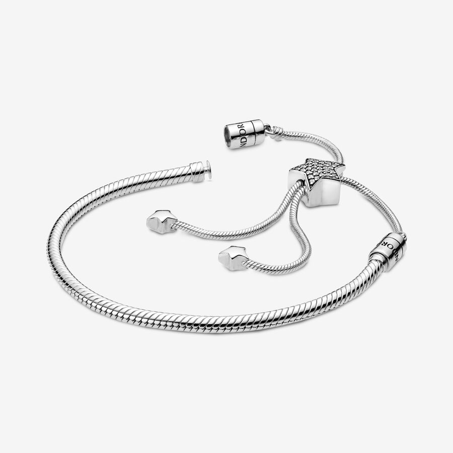 Let your dreams shine bright like a starry night filled with beaming, shooting stars, symbolized by our Pandora Moments slider bracelet hand-finished in sterling silver with a star-shaped sliding clasp. The sparkling starlight is further emphasised by the sterling silver stars made from cubic zirconia at the ends of the bracelet, which dangle as you move. Every time you take a quick glance at your snake chain bracelet, you’ll be reminded to dream as big and bold as a sky full of stars.