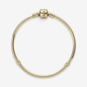 This charm bracelet is the perfect foundation for your Pandora collection. Hand-finished in 14k gold, this snake chain bracelet features Pandora’s iconic barrel clasp for a secure fit while the innovative threading system makes it easy to screw charms onto your bracelet. Simply add a couple of clips to divide the bracelet into three sections, then choose your favourite Pandora charms to express your unique style.