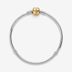 One of our signature styles, used by women around the world as a base for unique combinations of meaningful charms, this two-tone snake chain charm bracelet is made from sterling silver and solid 14k gold. Detailed with threads and fitted with a logo barrel clasp, it’s a classic carrier for meaningful adornments.