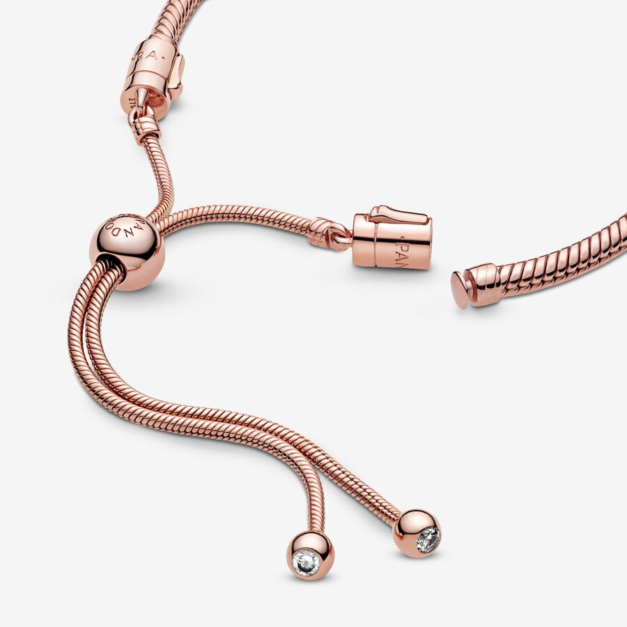 This stunning Pandora Moments Snake Chain Slider Bracelet is a sophisticated spin on the classic friendship bracelet. Hand-finished and 14k rose gold-plated – it features interchangeable end caps set with shimmering stones and an innovative sliding clasp that makes it easy to adjust. The perfect present for friends and loved ones, it can be worn as it is or filled with your favourite Pandora charms. The lobster clasp and jump ring are made from sterling silver plated with 14k rose gold.