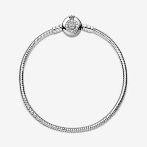 Bring some sparkle to every moment with the Pandora Moments Sparkling Crown O Snake Chain Bracelet. Hand-finished in sterling silver, the bracelet’s clasp features the iconic Pandora crown O monogram and two circles of sparkling clear cubic zirconia pavé. Another iconic Pandora design element, the snake chain, brings a chic and modern touch to your wrist. Stack it with other bracelets and load it up with favorite charms for a piece you’ll reach for over and over.