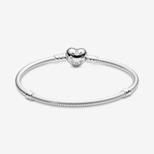 Add sparkle and romance to your charms with this stunning version of Pandora’s iconic snake chain bracelet. Hand-finished in sterling silver, this sleek style features a reversible heart-shaped clasp set with shimmering pavé stones on one side and embossed with the Pandora logo on the reverse. Simply turn the clasp to create two different looks. Wear this bracelet unadorned or filled with your favorite Pandora charms.