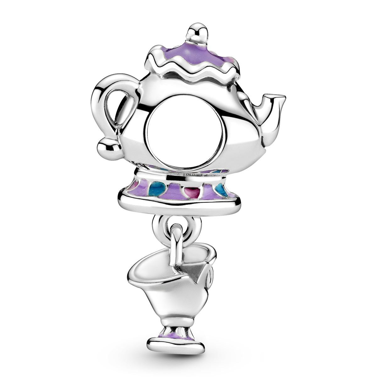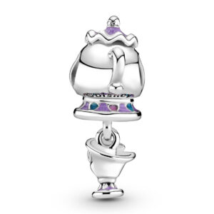 Be our guest and help yourself to this Disney Beauty and the Beast Mrs. Potts and Chip Dangle Charm. Featuring two of the most unforgettable characters from Disney’s Beauty and the Beast, this sterling silver Mrs. Potts-shaped charm features an adorable little Chip swinging from the base. Both characters are brought to life with lilac, blue and pink hand-applied enamel details. The sweet charm will add heartwarming cheer to every look.