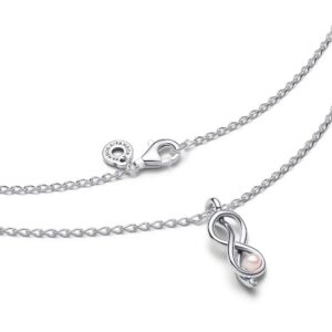 Bring a pop of pink to your neckline with the Infinity Knot Collier Necklace. This sterling silver necklace features a pink lacquered artificial pearl nestled inside an infinity knot symbol, which is set with sparkling stones at each end. Slide the pendant on the chain to adjust the length. Elegant yet irreverent, the pink pearl adds just enough colour to liven up any look – but can also function as a versatile neutral.