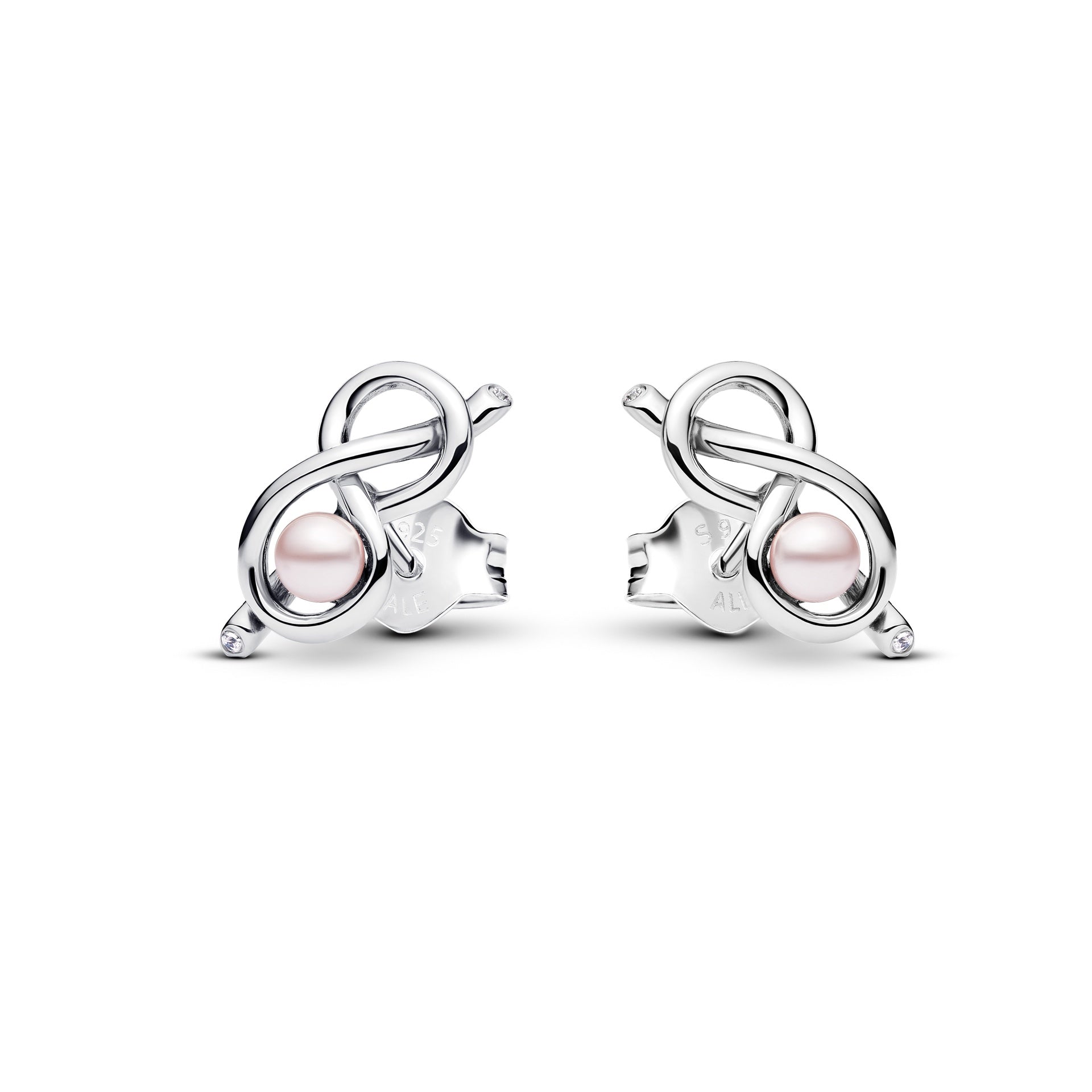 Bring a pop of pink to your ears with the Infinity Knot Stud Earrings. These sterling silver earrings feature pink lacquered artificial pearls nestled inside infinity knot symbols, which are also set with sparkling stones at each end. Elegant yet irreverent, the pink pearls add just enough colour to liven up any look – but can also function as a versatile neutral. Like all our infinity knot–inspired jewellery, these earrings symbolise everlasting love and interconnectedness.