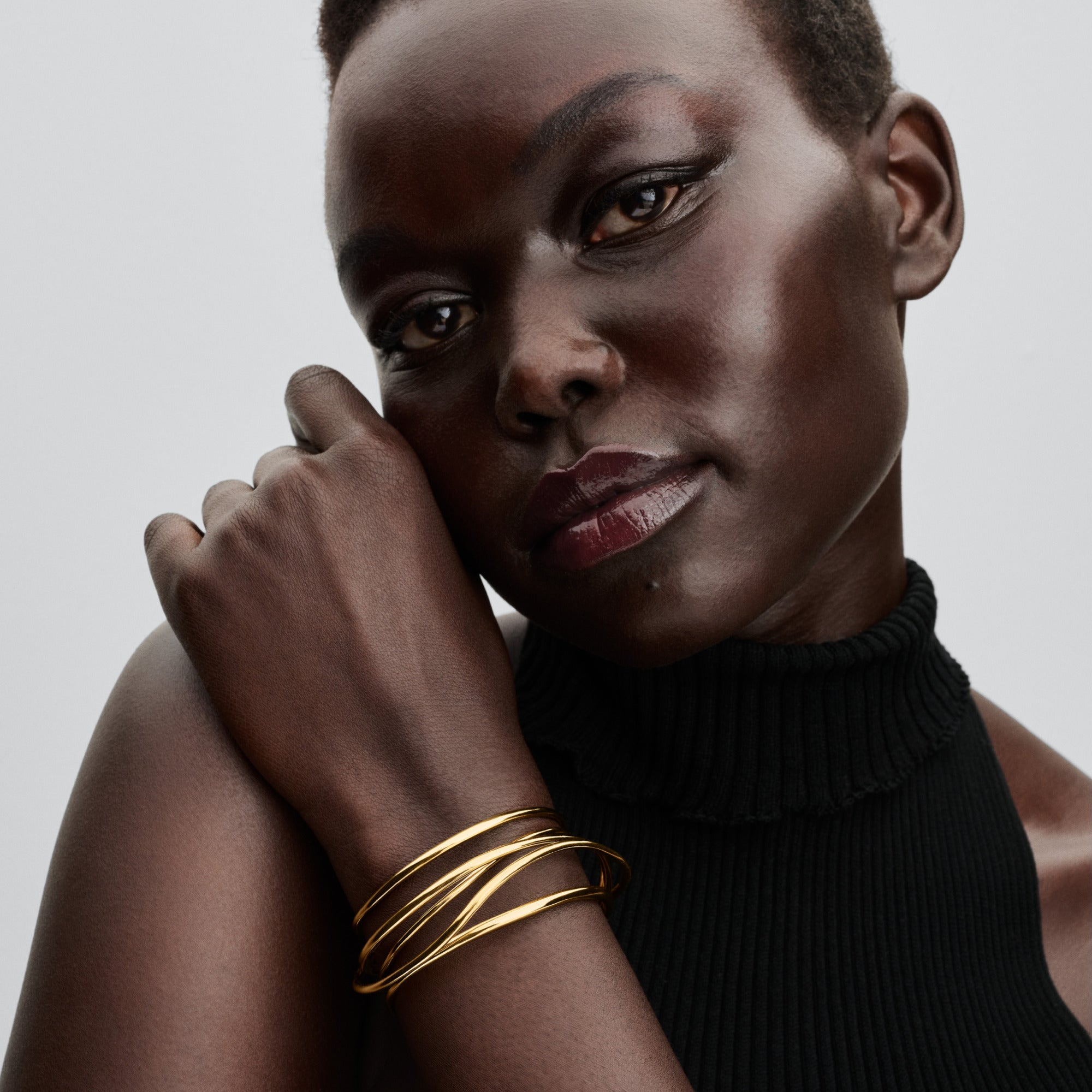 Elevate your style with the Organically Shaped Wired Open Bangle, featuring a bold design in 14k gold-plated wire. Crafted with curved and crossing lines, this bangle embodies freedom and self-expression.