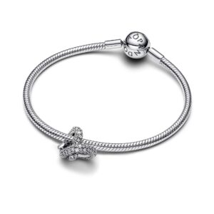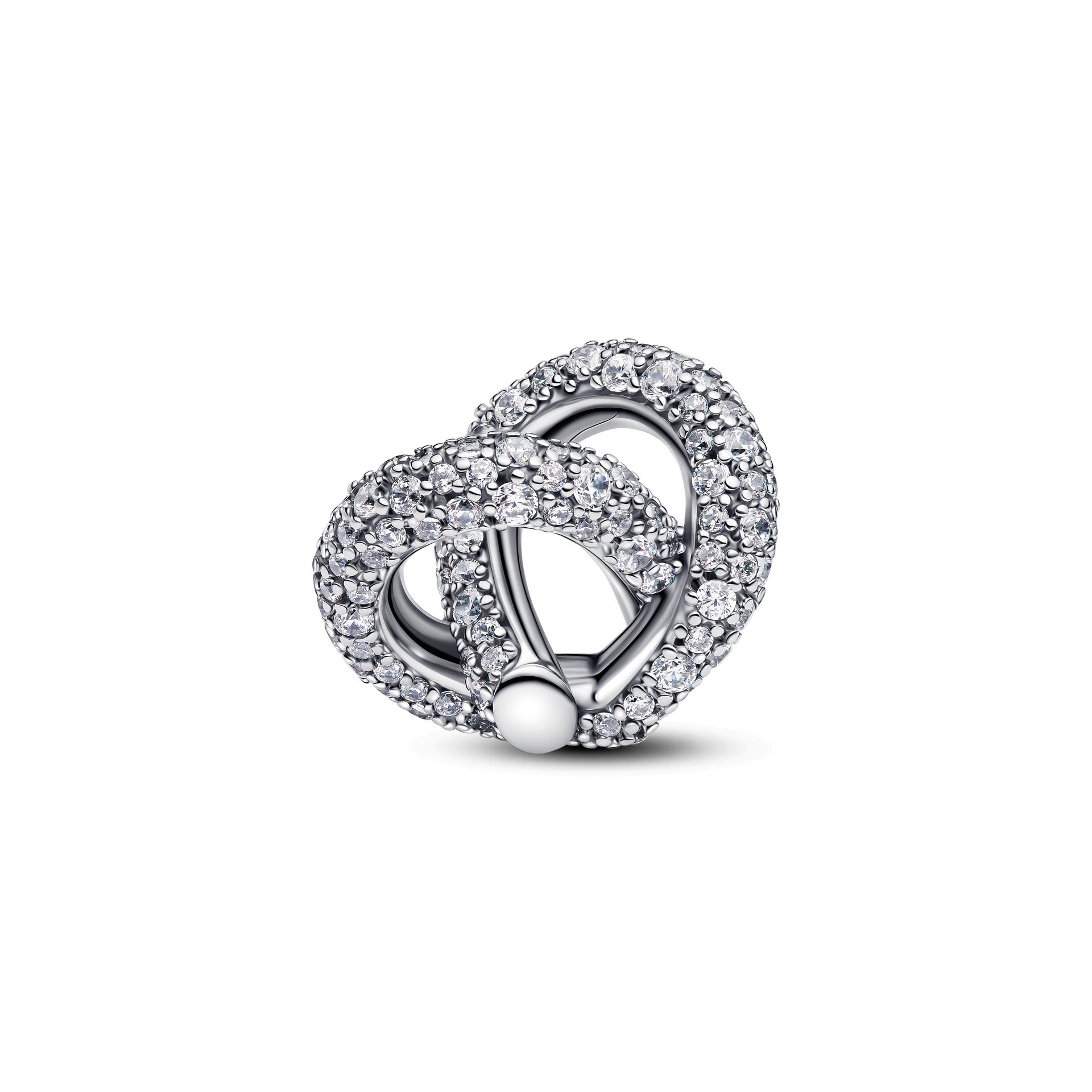 Add three-dimensional sparkle to your look with the Pavé Infinity Knot Heart Charm. This sterling silver charm is slightly oversized and features a knotted heart covered with pavé detailing. Inspired by everlasting love and interconnectedness, this charm brings as much meaning to your day as it does boldness to your look, with its structured, textural design. Pull your favourite snake chain bracelet or necklace through one of the loops to complete your perfect look.