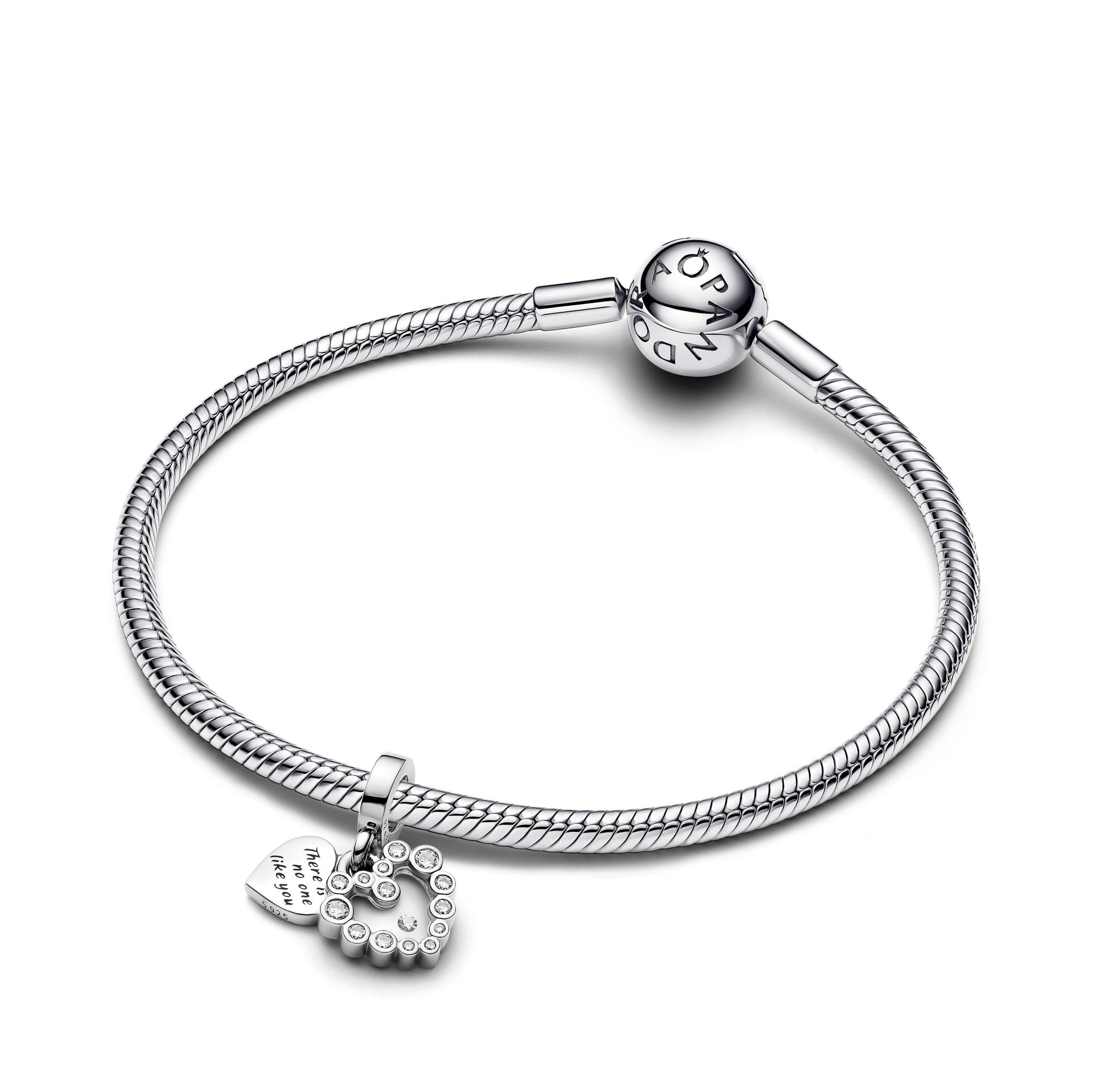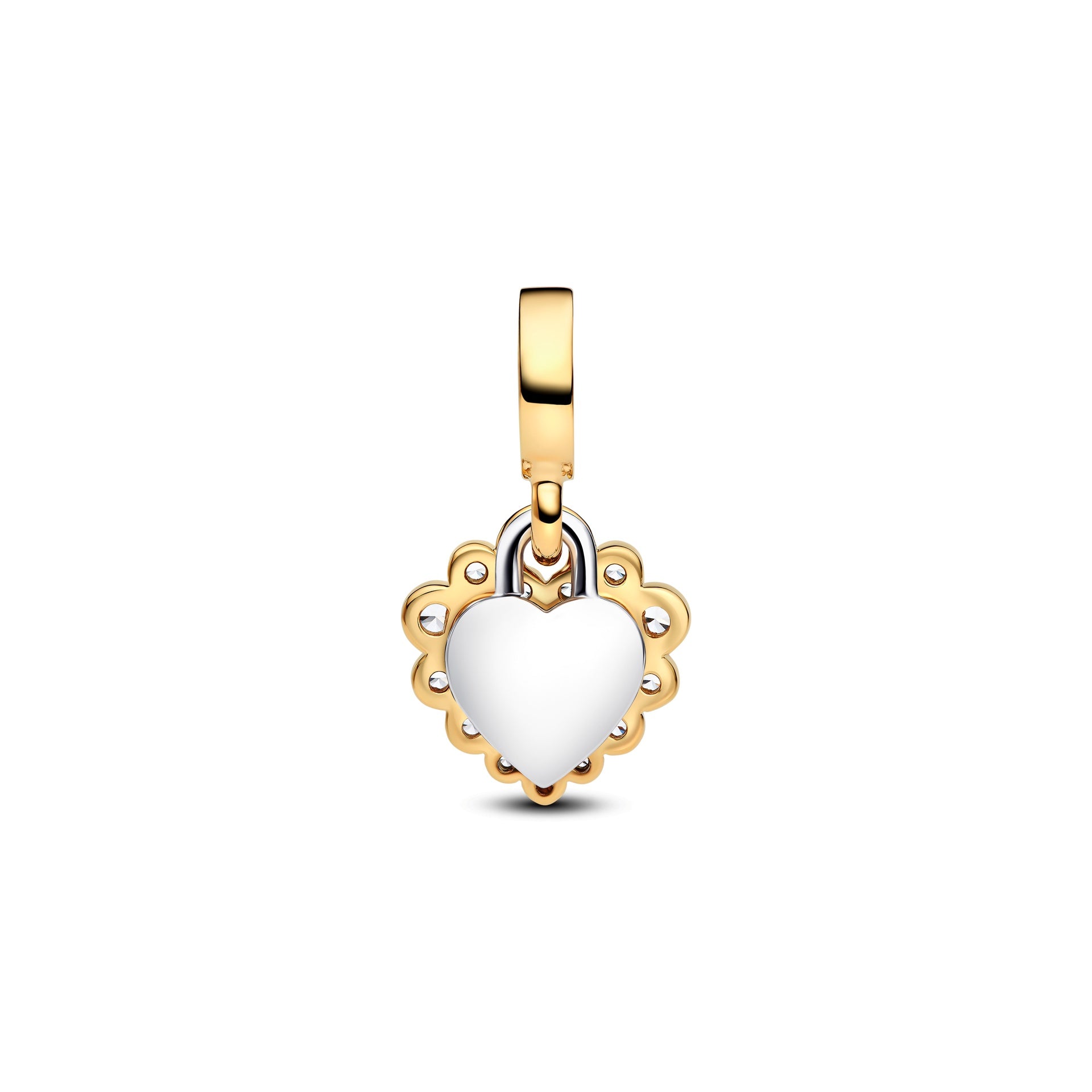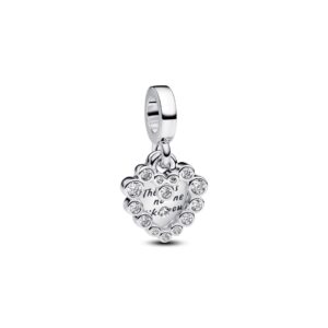 Make your feelings known with the Sparkling Heart Double Dangle Charm. Featuring sterling silver and 14k gold plating, this two-toned charm has two separate heart-shaped dangles. Sparkling stones form a border around the front dangle, with a floating stone at centre set in transparent resin. The back dangle reads “There is no one like you.” Inspired by motherhood in all its multifaceted expressions, this charm celebrates the power of a mother’s love.