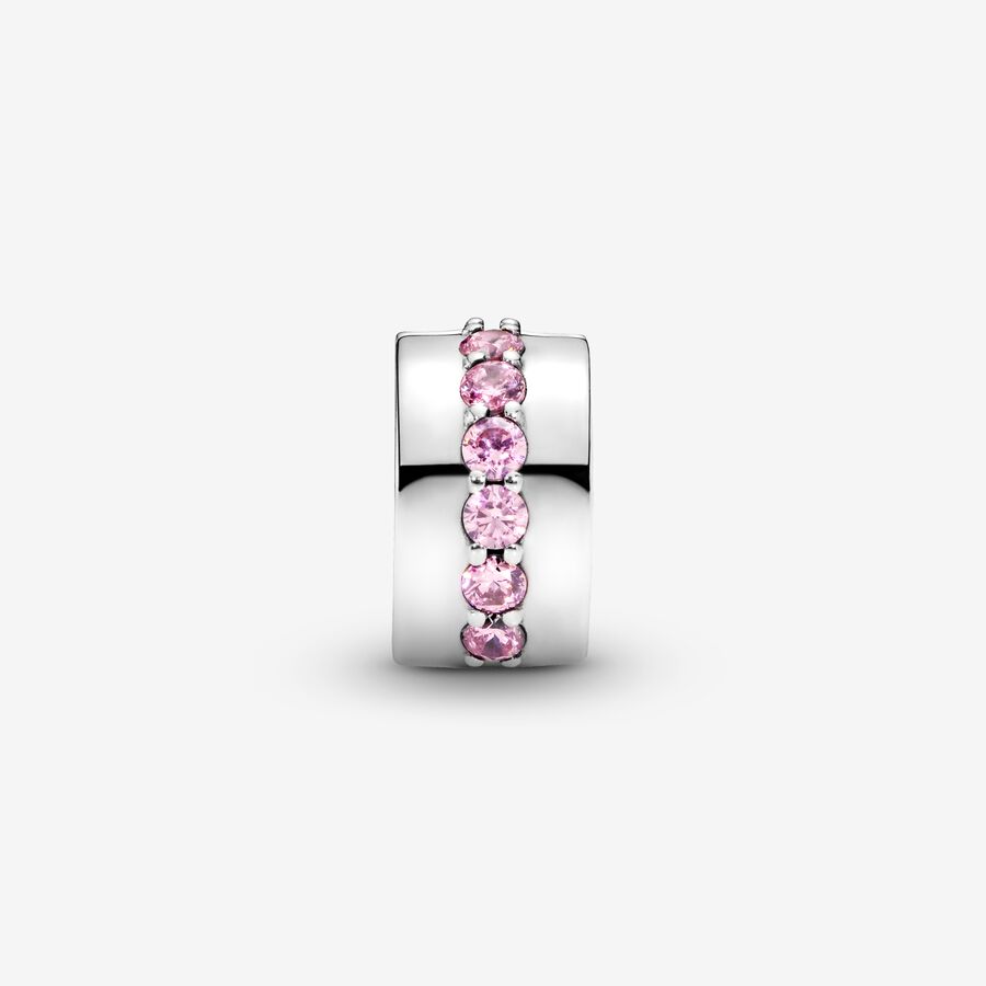 Our clip charms create balance on Pandora Moments bracelets, evenly spacing your adornments as well as adding decorative finish. This polished sterling silver design is carefully detailed by hand with a row of pink cubic zirconia, perfect for adding a splash of pink to your look. Mix and match with other favorites from the collection. This clip charm features no silicone grip, so it will slide if not styled onto threads (two raised charm dividers).