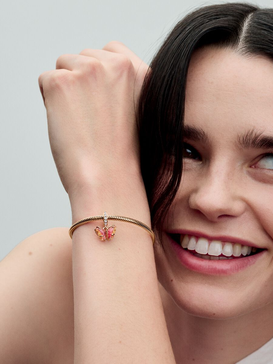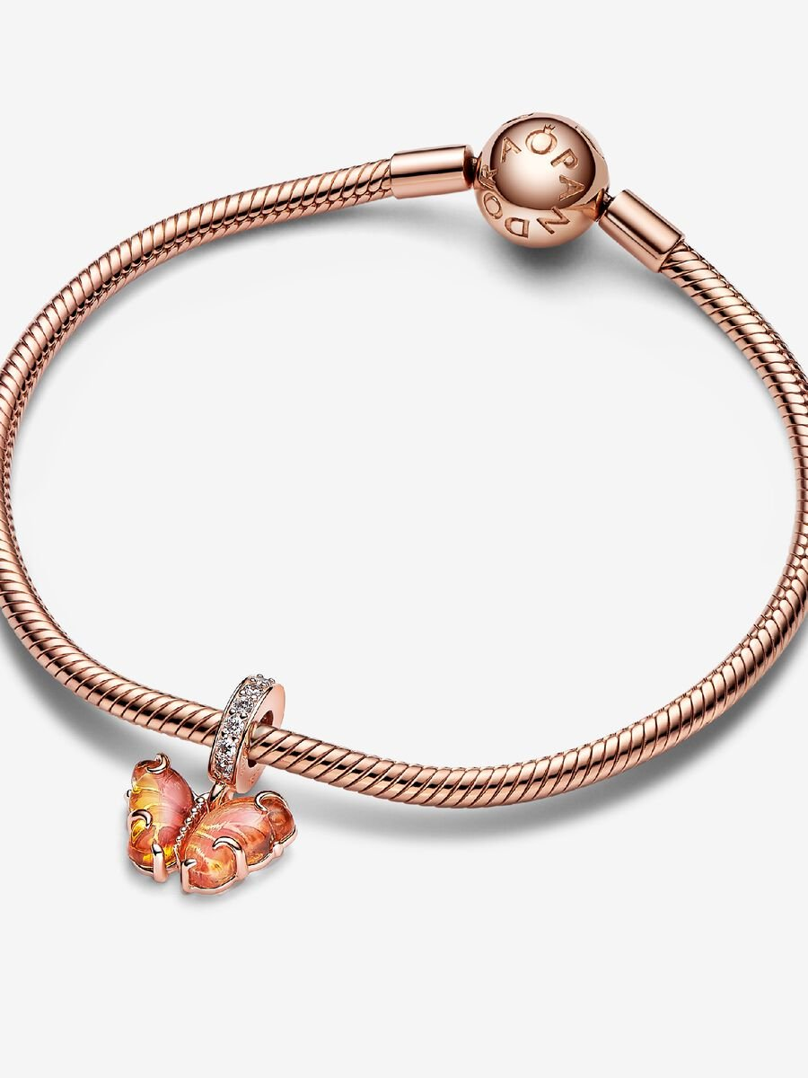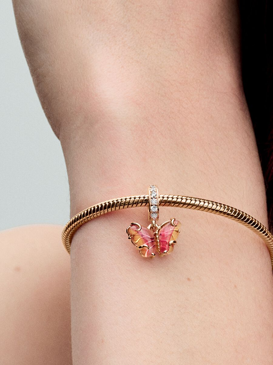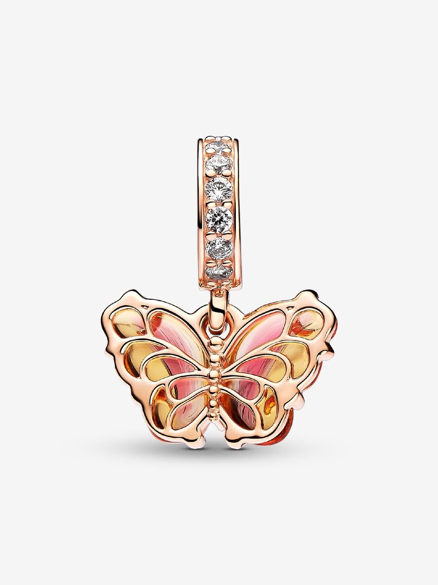 Transform into your best self with the Pink & Yellow Murano Glass Butterfly Dangle Charm. This 14k rose gold-plated charm features Murano glass wings in an orange-and-pink gradient with a cut-out pattern on the back that shows through the glass, and 14k rose gold swirls on the front. Microbeads on the butterfly’s body and pavé on the bail add a touch of delicate sparkle. Add this bright butterfly to your look as a powerful symbol of transformation and new beginnings.