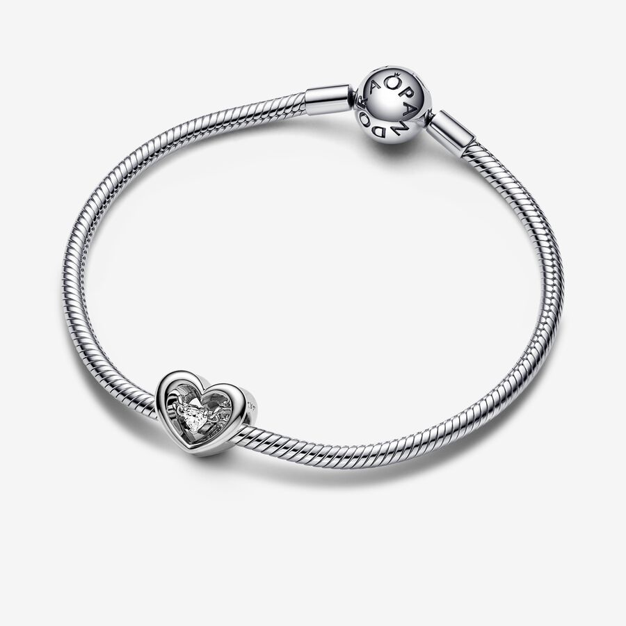 What the heart wants. Inspired by the joining of two hands to form a heart gesture, our Radiant Heart & Floating Stone Charm makes a sweet statement about the power of love. Hand-finished in sterling silver, a 3D open heart reveals a dangling heart-shaped faceted cubic zirconia within, sparkling as it catches the light. Gift it to the one who completes you.
