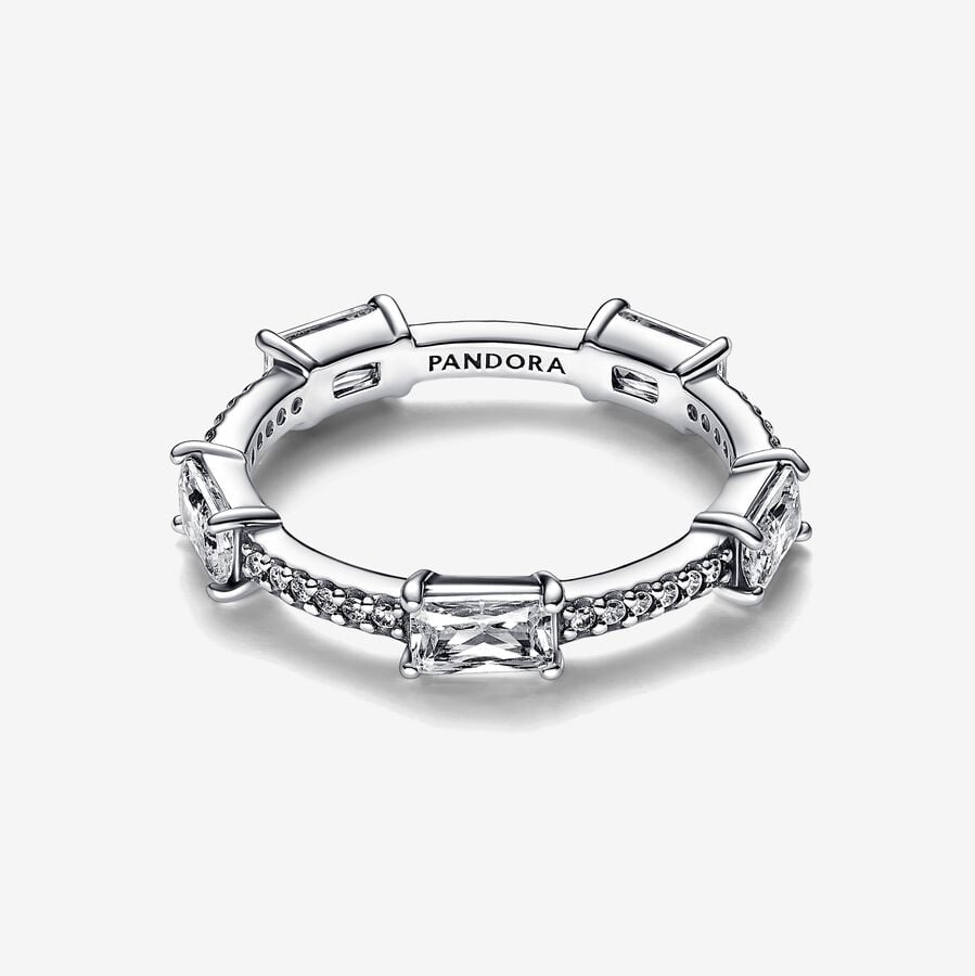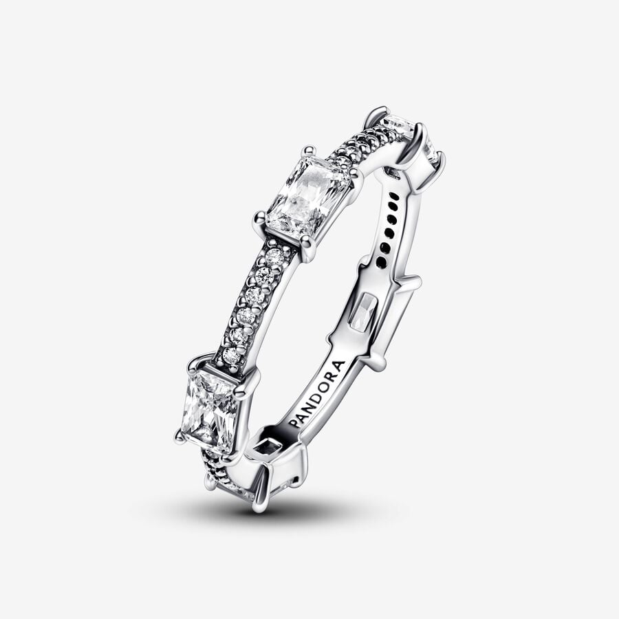 Sophisticated and elegant, this Rectangular Bars Sparkling Pavé Ring shines with an elegance that never goes out of style. Crafted from sterling silver, the band features a row of sparkling clear cubic zirconia pavé highlighted by five larger singular stones set at even intervals along the band. Inspired by classic tennis bracelets, this Timeless ring stacks beautifully and will effortlessly complement any look.StoneCubic ZirconiaColourClearProduct TypeRingsItem192397C01MetalSterling silverMaterialNo Other MaterialDimensionsDepth:2.55 mmHeight:3.9 mm