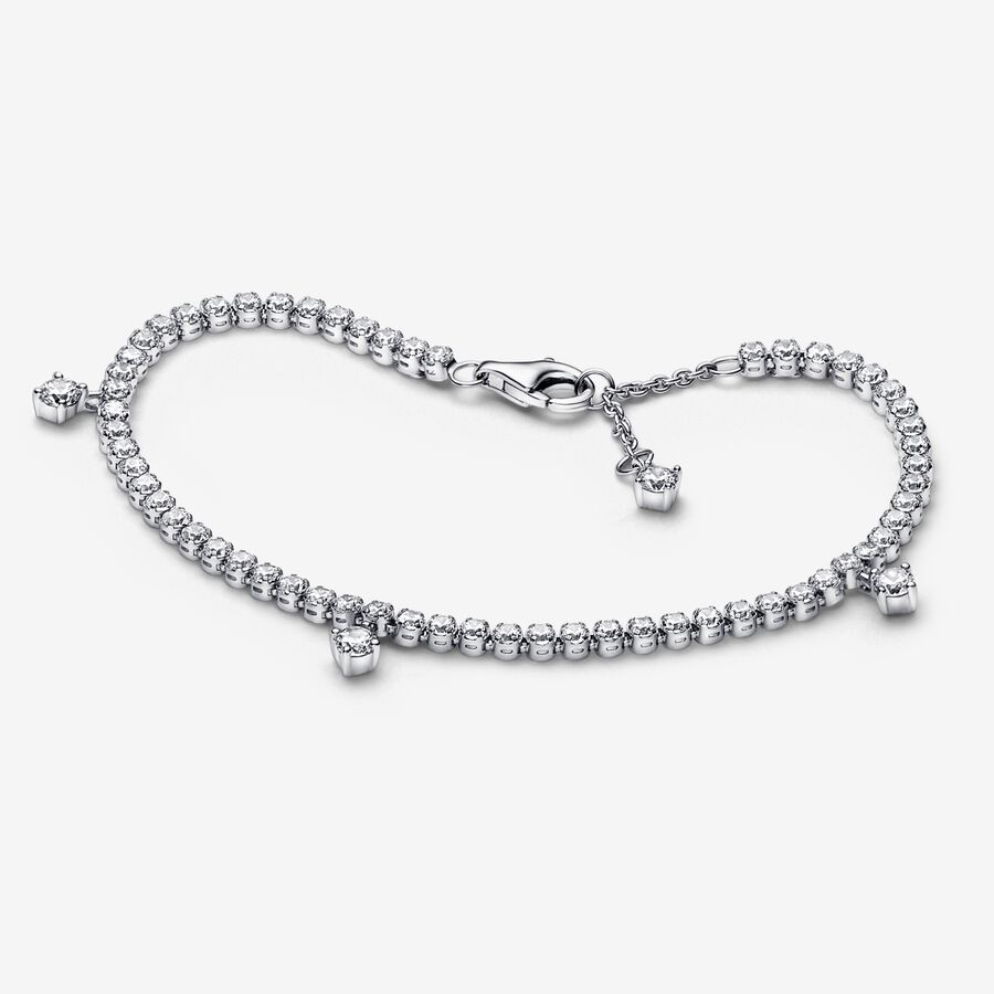 Make your holiday season sparkle. This sterling silver Sparkling Drops Tennis Bracelet is made up of a row of sparkling round brilliant cut cubic zirconia, decorated with dangling stones along the chain to make a statement fit for any occasion. Wear it on its own or stack bracelets of different colors and metal finishes for a modern look.