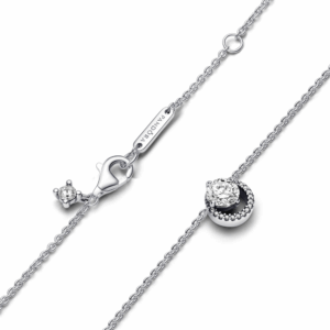 Channelling timeless elegance, the sterling silver Sparkling Round Halo Pendant Collier Necklace, adorned with clear cubic zirconia, represents the enduring beauty of circles. The pendant features an off-centre, prong-set round stone that delicately overlaps a pavé halo, allowing it to slide freely along the adjustable 38 cm, 42 cm, or 45 cm cable chain. With an engraved Pandora logo and a dangling stone by the lobster clasp, this necklace adds sophistication to any look. A perfect gift for those who appreciate classic beauty and elegance.