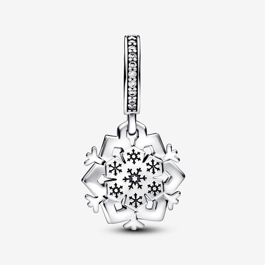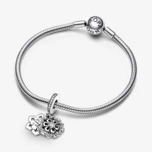 Celebrate what makes each of us unique with this double dangle charm featuring a delicate snowflake design crafted in sterling silver. One snowflake dangle features sparkling clear cubic zirconia pavé around a central stone, and the other has an engraving that reads “You are one of a kind.” Cut-out and imprinted details create an intricate piece that captures the beauty of snowflakes dancing in the winter air. The perfect gift to express how special your loved one is to you.