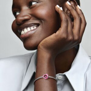 A jewelry gift as sweet as your love. The Sparkling Sprinkled Donut Charm is inspired by a universe of pop art and saturated candy colours. This playful yet modern charm takes the shape of a donut in sterling silver, complete with hand-applied pink gradient enamel frosting and a bite taken out of one side (who can resist a delicious donut?). The frosting is topped with polished silver sprinkles, one clear cubic zirconia and two Aurora Borealis cubic zirconia – shimmering with clear, pink and blue tones depending on how the light hits. The back is engraved with the words “Love at the first bite.” An irresistible treat to add to your favourite Pandora jewellery.
