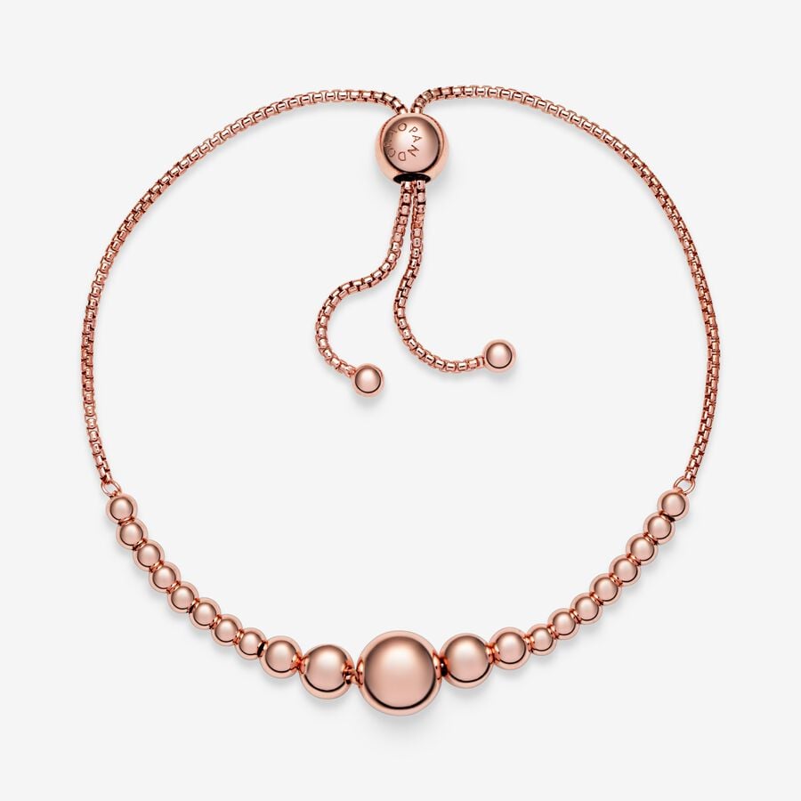 The last word in elegance, the String of Beads Slider Bracelet is minimalist, chic and perfect for stacking. Hand-finished in 14k rose gold-plated unique metal blend, the design is a sleek addition to your arm and an ideal piece to compliment your other Pandora bracelets. The rose-hued spheres, decreasing in size from the largest at the center, symbolize continuity, making it a perfect gifting piece to show that your love will always be there.