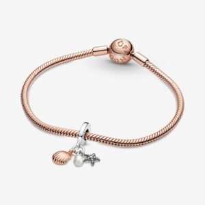 Inspired by the unique beauty of each seashell and pearl in the ocean, this triple charm features a trio of ocean treasures to bring the beach to your bracelet. Hanging from the bail are a sterling silver starfish with raised micro-beads, a treated freshwater cultured pearl and a 14k rose gold-plated seashell with realistic grooved detailing. The side of the bail has the message “You are my treasure.” The perfect gift for the beachgoer in your life. NOTE: the relevant treatments for treated freshwater cultured pearls are bleaching or dyeing and luster enhancement.